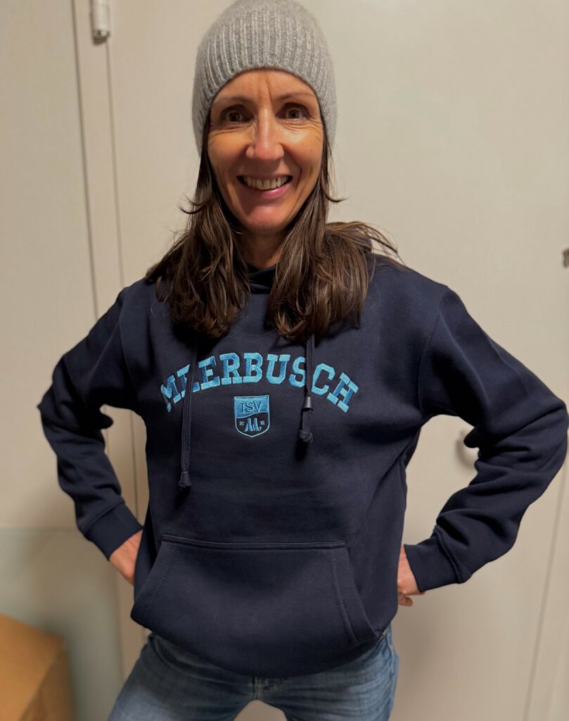 Unsere TSV-Laufikone Sandra zeigt hier das schöne Kleidungsstück und war begeistert von der Qualität.