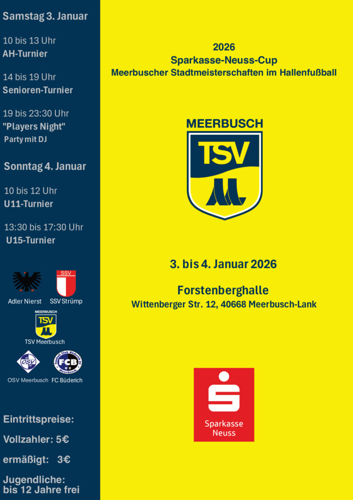 Der TSV Meerbusch freut sich besonders mit der Sparkasse Neuss einen bedeutenden und leistungsfähigen Sponsor für dieses erste sportliche Highlight des Jahres 2026 gewonnen zu haben. Unter dem Namen „Sparkasse-Neuss-Cup“ spielen am 3. und 4. Januar Junioren- und Senioren-Teams der großen Meerbuscher Fußball-Vereine die Stadtmeister im Hallenfußball 2026 aus.