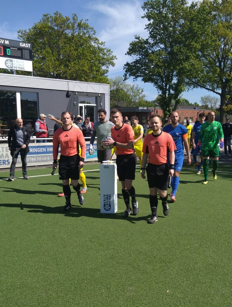 Von Beginn an kamen sie besser ins Spiel als der Gegner. Mit kontrolliertem Kurzpassspiel ließen sie dem von Verletzungssorgen geplagten Tabellen-Vierten keinen Raum, sein druckvolles Angriffsspiel aufzuziehen. Gegen die von Trainer Marc Roch gut eingestellte TSV-Elf konnten sich die Spieler des SC St. Tönis keine klaren Torchancen erspielen. Vielmehr kamen die Meerbuscher Spieler zu ersten Einschussmöglichkeiten. In der 11. Minute vergab Florian Berisha nach Flanke von Mattia Mjetic die große Chance zur zu diesem Zeitpunkt nicht unverdienten 1:0 Führung. Es dauerte bis zur 22. Spielminute, bis das Heimteam zur ersten klaren Torchance kam. Julian Andres Suaterna Florez traf aber nur die Latte. Trotzdem hatte in dieser Spielphase der TSV Ball und Gegner fest im Griff. Umso überraschender fiel in der 23. Minute das 1:0 für die Heimmannschaft. Diese Führung war aber nicht Folge einer gelungenen Angriffskombination, sondern eines katastrophalen Fehlers des TSV-Keepers Franz Langhoff. Gegen Morten Heffungs vertändelt er den Ball, so dass der St. Töniser Stürmer den Ball nur noch ins leere Tor schießen musste. Die Meerbuscher Spieler ließen sich durch den Treffer aber nicht verunsichern und kamen in der 31. Spielminute nach einer Ecke durch Noah van Lent zum 1:1 Ausgleich. In der 44. Spielminute konnten sie sogar durch Florian Berisha mit 2:1 in Führung gehen. Die Freude über die Führung währte aber nicht lange. In der ersten Minute der Nachspielzeit gelang den Hausherren nach einem Freistoß noch der Ausgleich durch Julian Andres Suaterna Florez.